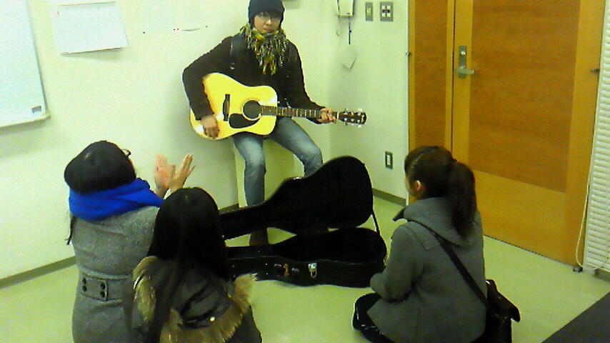 写真は、ギターを弾く、キム兄とそれに群がるひとびと。